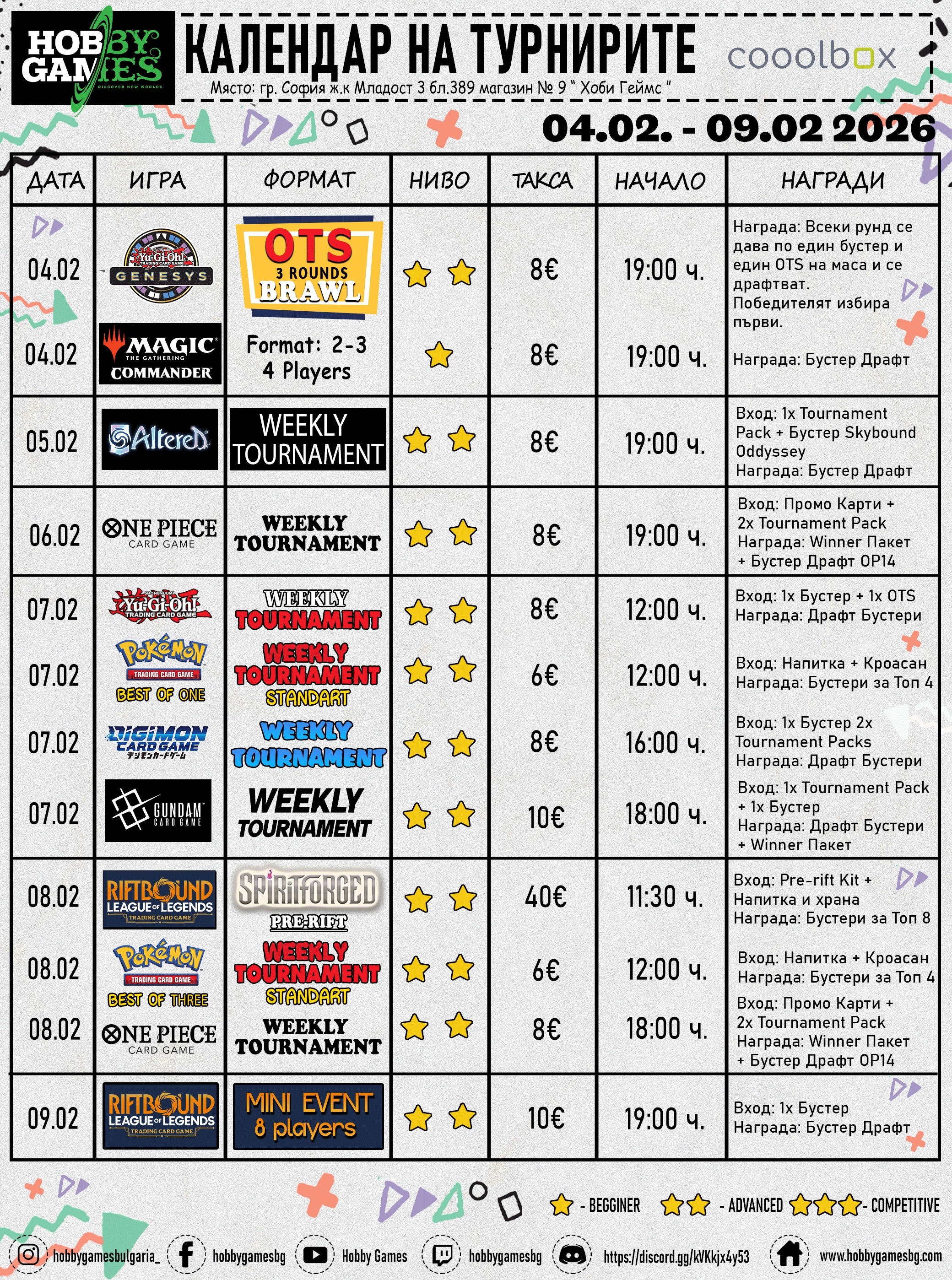 Hobby Games’s Tournaments are held in Hobby Games’s store/club located in Sofia, Bulgaria.