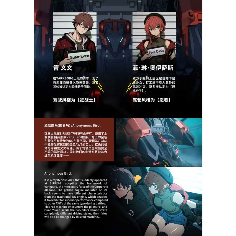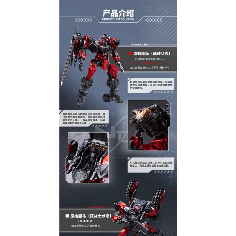 BigFirebird Build ne aduce un nou kit de model la scara 1/60 al modelului Anonymous Bird din manga SF „BIRD/BINARY Shade”! Această unitate este plină de trucuri care îi permit să se transforme în patru forme diferite! Unitatea toracică se desface pentru a dezvălui o cabină de pilotaj, iar o figurină pilot poate fi plasată înăuntru; armele sale unice sunt incluse. Comandă-l astăzi pentru propria ta colecție!