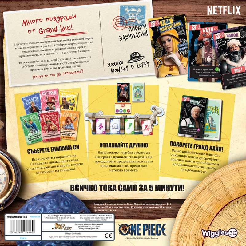Bazat pe celebra serie Netflix One Piece, 5-Minute One Piece este un joc cooperativ de cărți rapid și dinamic, în care tu și echipajul tău vă întreceți pentru a cuceri Grand Line… în doar cinci minute!